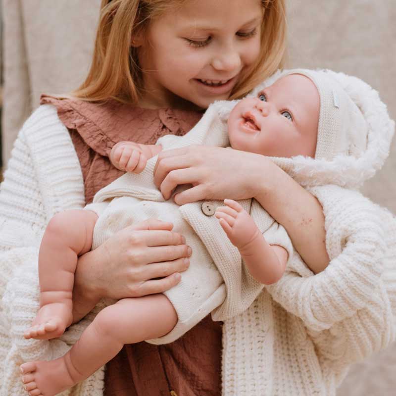 Păpușa reborn Diego de la brandul spaniol Arias nu este doar o jucărie, ci o operă de artă cu un realism și detalii unice, asemănătoare unui bebeluș adevărat. Fiecare parte a acestei remarcabile păpuși vii, cum ar fi dimensiunea și trăsăturile faciale, a fost creată cu extremă grijă și măiestrie. Roșeața de pe obraji și pielea moale la atingere contribuie la aspectul extrem de viu al lui Diego. În plus, corpul său este moale și flexibil datorită vinilului de înaltă calitate din care este fabricat, asigurând siguranță și durabilitate în timpul jocului. O caracteristică deosebit de atractivă a lui Diego este parfumul său irezistibil de vanilie, care face ca îmbrățișarea lui să fie și mai specială și aduce căldură și confort fiecărui copil. Îmbrăcat într-un elegant set bej tricotat, completat de o geantă de transport confortabilă, Diego poate deveni cu ușurință companionul constant al copilului dumneavoastră. Prietenia cu el promite să aducă nu numai momente de joacă de neuitat, ci va încuraja și imaginația copiilor, dezvoltându-le în același timp simțul responsabilității și grija față de ceilalți.