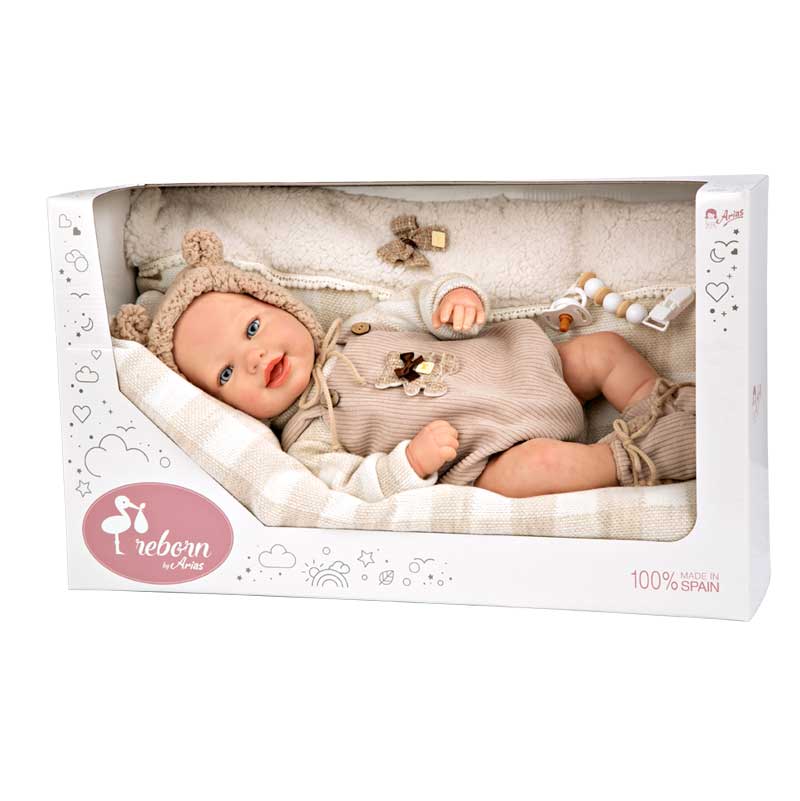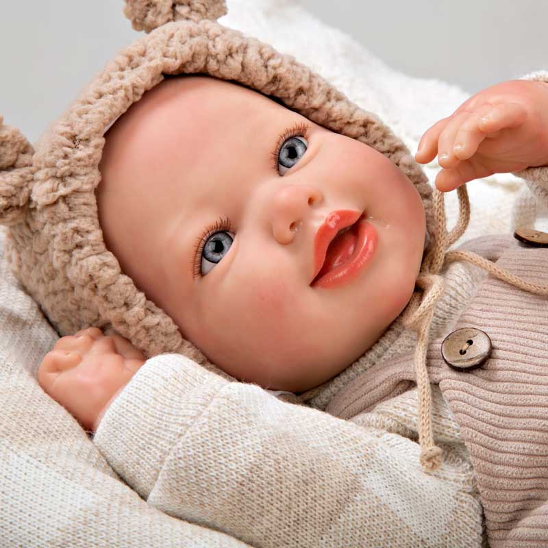 Ruben este atât de drăguț cu acel zâmbet larg! Este o păpușă bebeluș realistă, parte din seria Reborn a brandului spaniol Arias , o companie cu peste 40 de ani de experiență în crearea de păpuși realiste.
