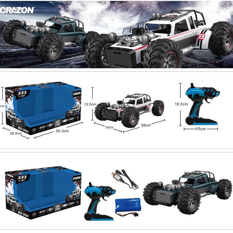 Cursa ta off-road începe cu un jeep de curse 4x4 de la Crazon ! Suspensia, puternică și stabilă, ajută mașina să traverseze orice teren - depășește obstacole, denivelări, pietre mari și diferite drumuri. Jeep-ul de curse cu o scară de 1:10 are un design extrem de realist și inovator, care oferă senzația unei curse reale. Roțile de înaltă calitate se mișcă rapid și execută tot felul de manevre complexe, iar cu efectul de fum inclus vei impresiona pe toată lumea oriunde te-ai afla. Va crea o aventură spectaculoasă și incitantă, pe care o poți conduce cu încredere și încredere în sine. Telecomanda contribuie la experiența de viteză maximă și dezvoltă la copil calități precum coordonarea, concentrarea și orientarea spațială. Modelul dezvoltă o viteză de până la 20 km/h , ceea ce îl face invincibil împotriva altor concurenți. Controlează jeep-ul de curse rapid de la Crazon și câștigă pe fiecare pistă!