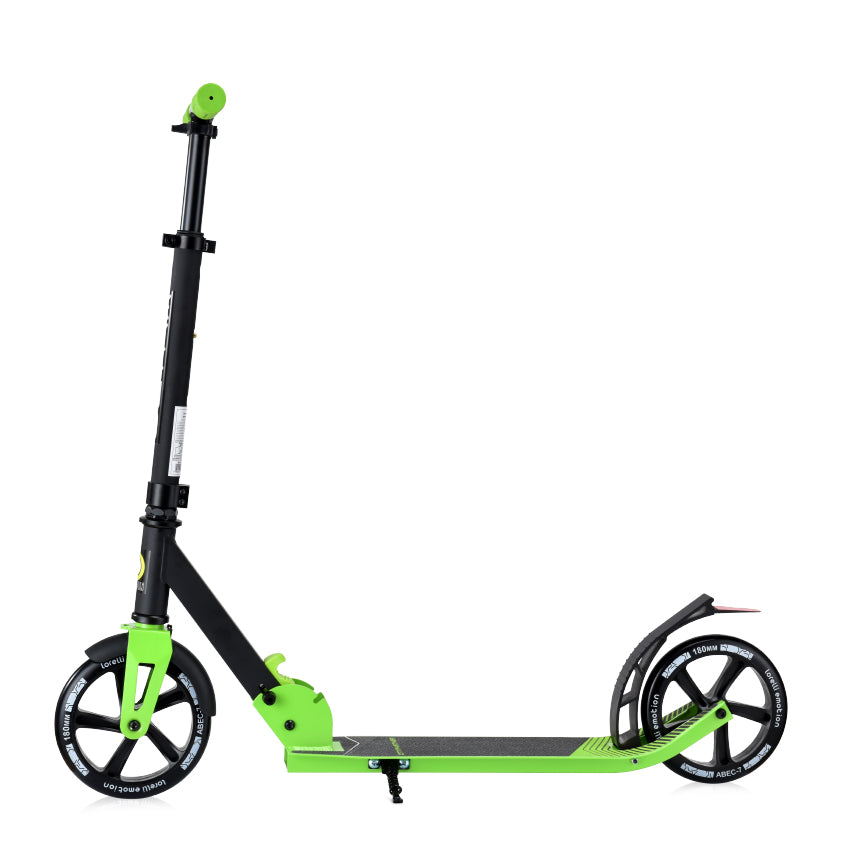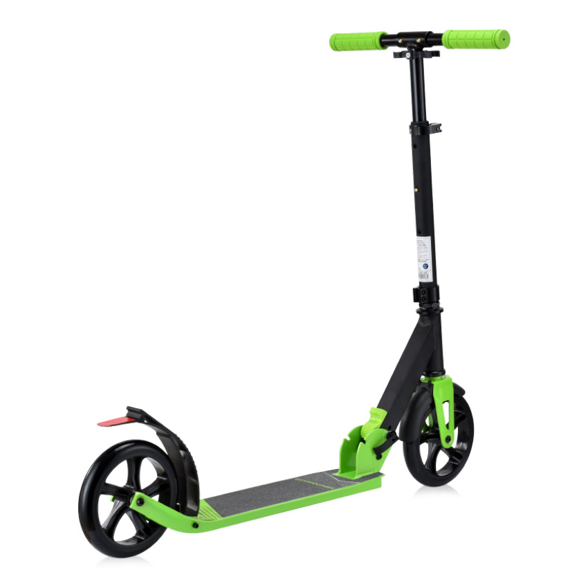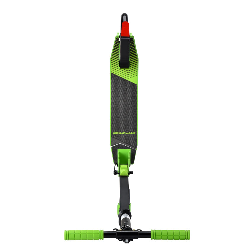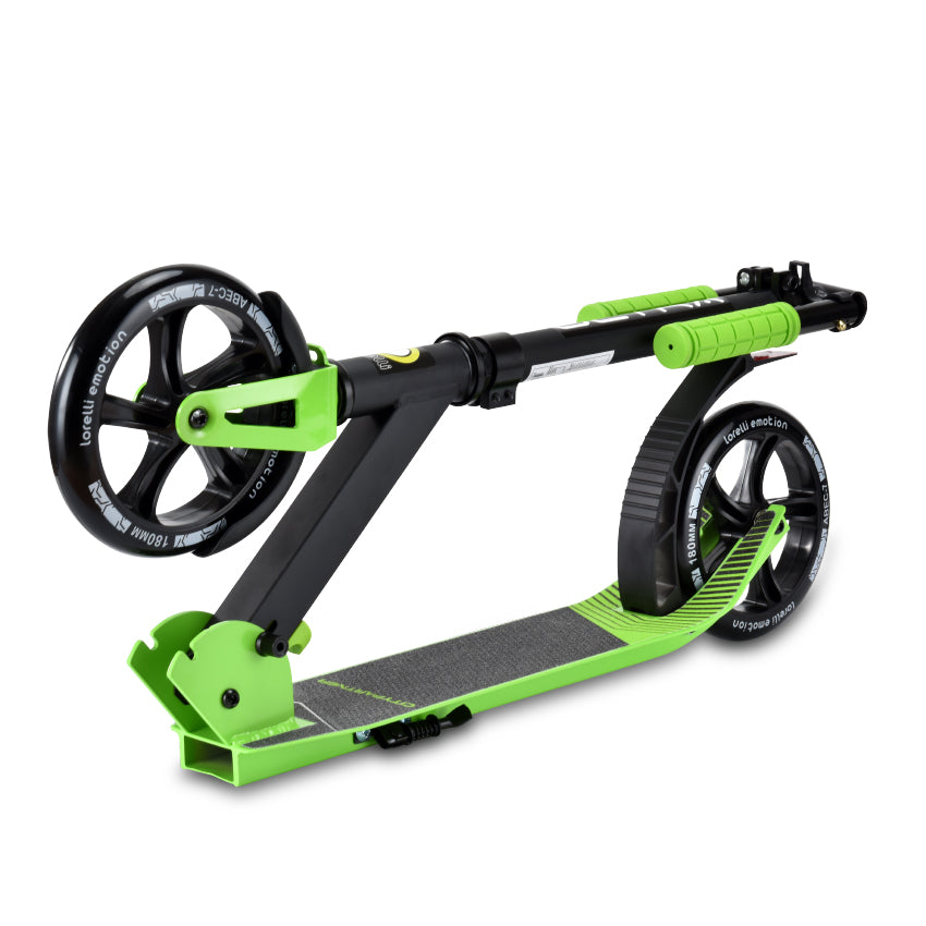 Anvelopă față din poliuretan cu miez de aluminiu 100/24 ​​mm, anvelopă spate din poliuretan cu miez de aluminiu 100/24 ​​mm, mânere, ghidon în formă de Y pentru mers dinamic, care poate fi rotit la 360°, frână de picior rigidă, platformă din aluminiu cu strat antiderapant: 500/100 mm, suport de blocare - aluminiu / 4 șuruburi /