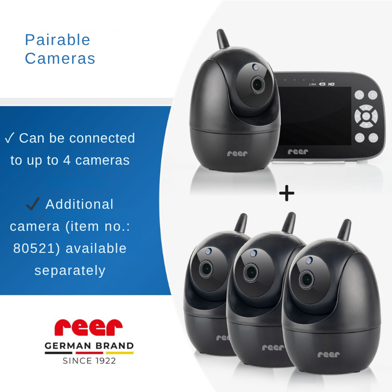 С BabyCam Pro HD Move можете да свържете до четири камери към родителското устройство, което ви позволява да наблюдавате едновременно няколко детски стаи. Това е особено удобно, ако имате няколко деца. Допълнителните камери се предлагат отделно (арт. № 80521) и могат лесно да се интегрират в системата.