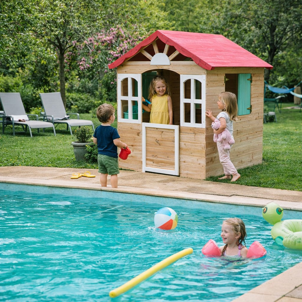 Къщичката е изработена от натурално дърво и се отличава със стабилна и устойчива конструкция, подходяща за продължителна употреба на открито. Реалистичният дизайн с врата и прозорци превръща играта в истинско преживяване, като позволява на децата да влизат в различни роли – дом, магазин, кът за игра или творческо пространство.