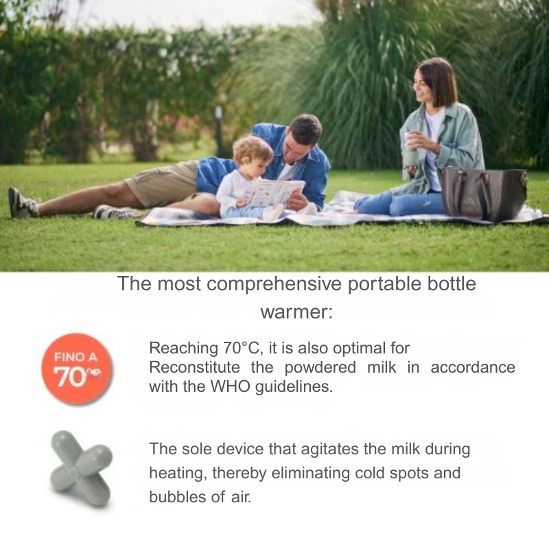Възможността да достигне 70°C, преносимият нагревател за шишета Mix70 може да се използва и за приготвяне на мляко на прах, когато сте навън, в съответствие с насоките на СЗО за правилно приготвяне на мляко на прах за кърмачета.