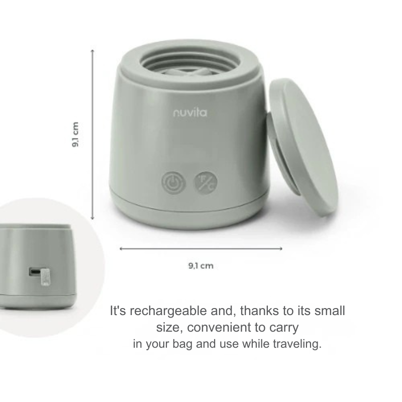 Малък, лек и с презареждаща се батерия, нагревателят за шишета Nuvita Mix70 е удобен за носене в чанта по време на разходка. Капакът на винт предотвратява протичане и гарантира, че млякото няма да се разлее. Това е идеалното решение за пътуване и употреба в движение, а също така е перфектен за нощно хранене.