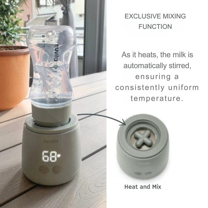 Преносимият нагревател за шишета Mix70 от Nuvita революционизира начина, по който млякото се затопля извън дома, благодарение на две уникални характеристики: