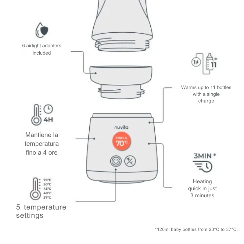 Универсален преносим нагревател за шишета с функция за затопляне и разбъркване. Загрява млякото и разбърква на равни интервали за равномерна температура без студени петна. Бързо затопляне само за 3 минути и задържане на топлината до 4 часа (*120 мл бебешко шише от 20°C до 37°C). 5 температурни настройки: 37°C, 40°C, 45°C, 50°C или 70°C. До 11 бебешки шишета с едно зареждане. Акумулаторна батерия USB (зарядно за батерията е включено). Съвместим с най-продаваните марки бебешки шишета в световен мащаб благодарение на 6-те адаптера, включени в опаковката.