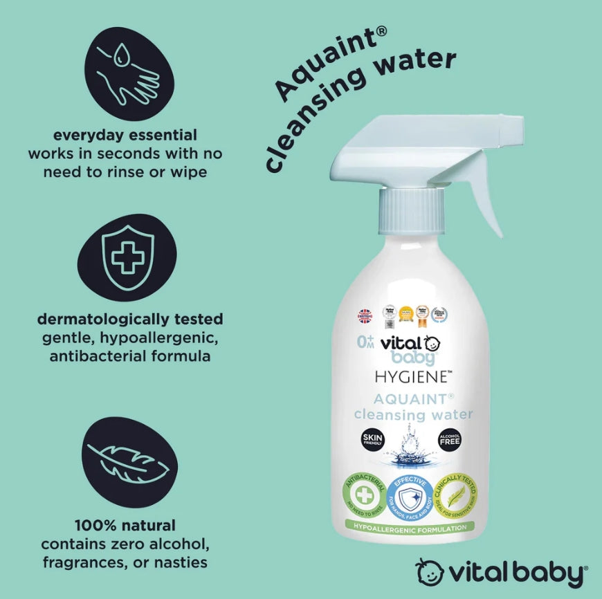 Абсолютно - съставките са напълно безопасни за контакт с кожата на бебето от самото раждане. Можете да пръскате дори и върху най-деликатната кожа. Aquaint е дерматологично тестван, за да се гарантира, че е нежен и хипоалергенен.