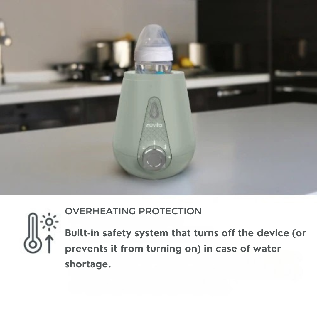 Благодарение на системата за защита от прегряване, която изключва устройството (или предотвратява включването му) в случай на ниски нива на водата, електрическият затоплящ уред за бутилки Nuvita е безопасен както у дома, така и в колата.