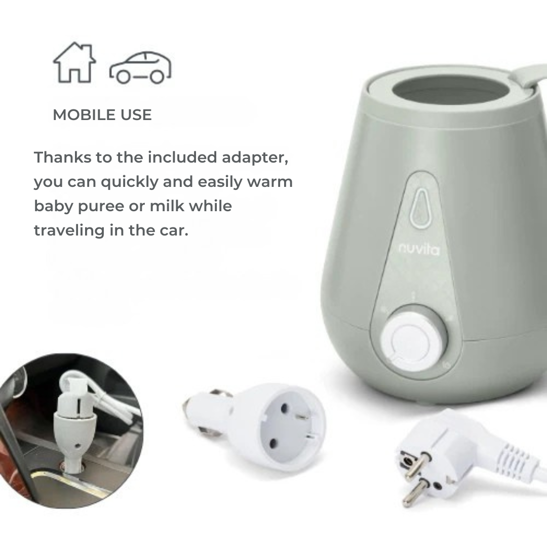 Затоплящият уред за бутилки за дома и колата Nuvita е идеален за затопляне и размразяване на мляко и бебешка храна по най-правилния и бърз начин – дори по време на пътуване.