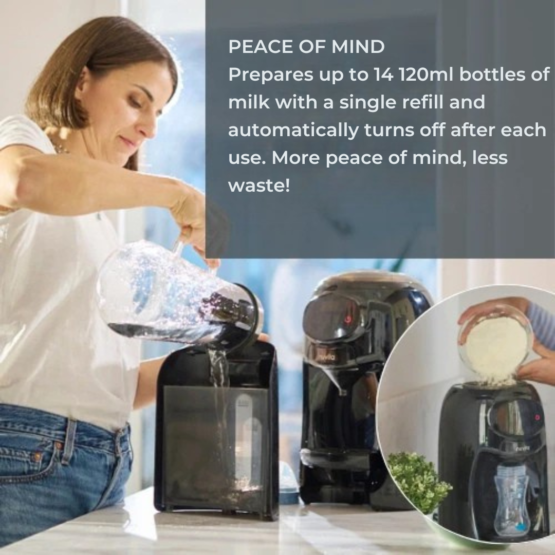 До 14 бутилки от по 120 мл могат да се приготвят с едно пълнене, безопасно и хигиенично; млякото на прах остава в предназначения за него контейнер, докато смесването и загряването се извършват в отделна, затворена среда, което значително намалява риска от замърсяване.