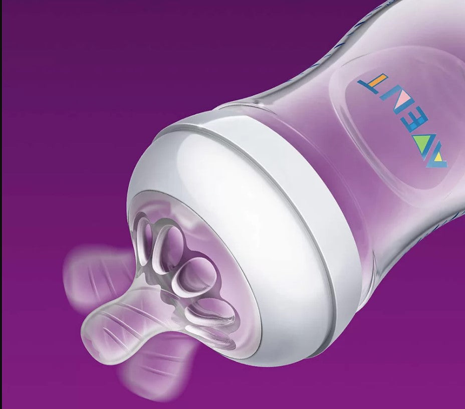 Биберонът с широка периферия, наподобяващ формата на гърдата, улеснява комбинирането синирането. Спираловидният дизайн не позволява на биберона да се огъва или да потъва по време на хранене, а меката текстура максимално наподобява усещането за майчина гърда.