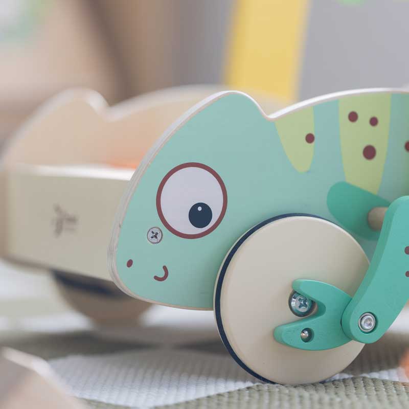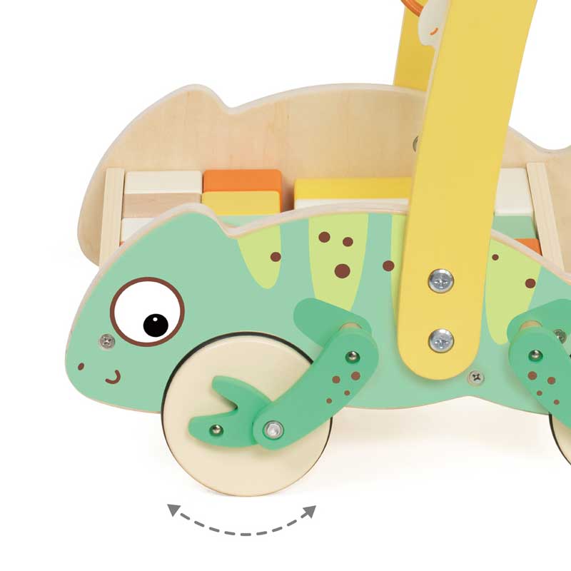 Подкрепете увереното прохождане на вашето дете с очарователната дървена проходилка Classic World с впечатляващ дизайн на хамелеон. Играчката впечатлява с веселата си визия – усмихнато личице, нежни пастелни цветове и подвижни крачета, които се поклащат забавно при бутане.