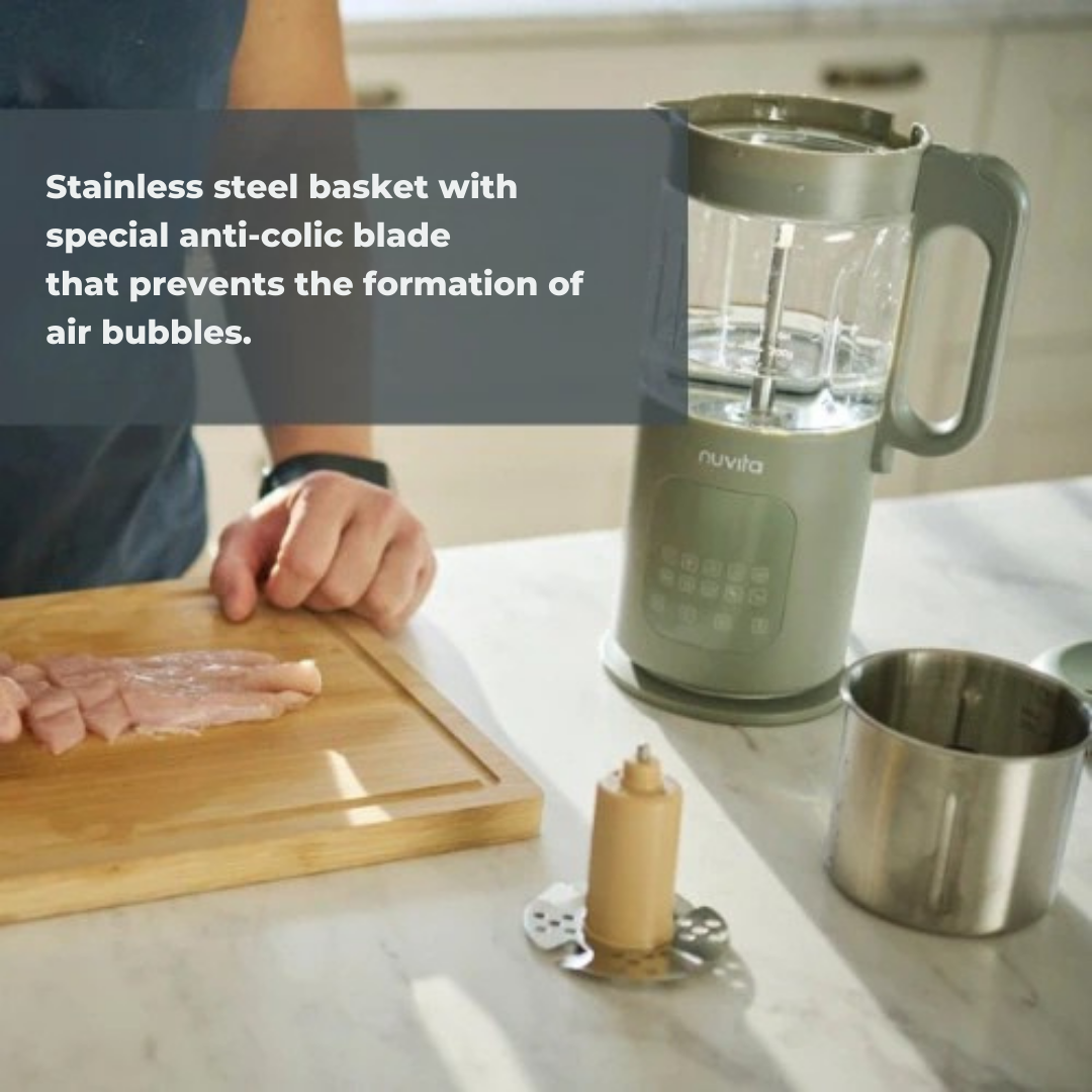 Новият уред за приготвяне и хомогенизиране на бебешка храна от Nuvita е оборудван с 3 специални остриета, които позволяват различни приготвяния (от нарязване до пюриране) с различни количества, консистенции и видове храна, за да се приготвят разнообразни ястия, подходящи за различните етапи на отбиване. Освен това, двойният контейнер позволява едновременното приготвяне на две различни храни: едната в стъкления буркан (с 2 сменяеми остриета) и едната в кошницата от неръждаема стомана, със специално острие против колики, което предотвратява образуването на въздушни мехурчета.